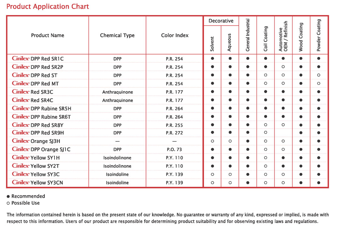 This chart is based on our current market and technical knowledge. There is no guarantee of result and in any case, users should test the pigment in their own binder or polymer system for their specific application.