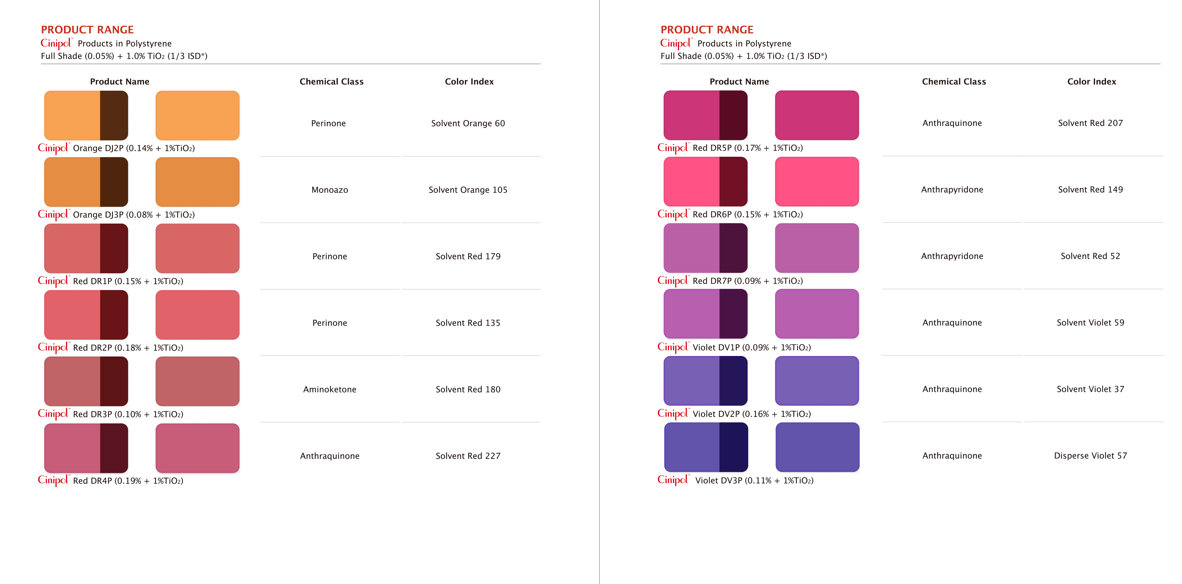 先珀®(Cinipol®)系列為高性能聚合物可溶性顏料。具有高純度,高耐溫,顏色艷麗等特點(diǎn)。廣泛適用于聚對(duì)苯二甲酸乙二醇酯(PET)、聚碳酸酯(PC)、聚甲基丙烯酸甲酯(PMMA)、丙烯腈-丁二烯-苯乙烯(ABS)、尼龍(PA)等多種工程塑料體系及聚酯纖維(PES)的著色。該系列優(yōu)異的溶解性和耐溫性使產(chǎn)品在工程塑料/合成纖維加工過程中易于分散使用,并可滿足各類制品戶內(nèi)外的耐光/耐候使用要求。本系列產(chǎn)品亦可用于需要與食品直接接觸的塑料包裝制品中。